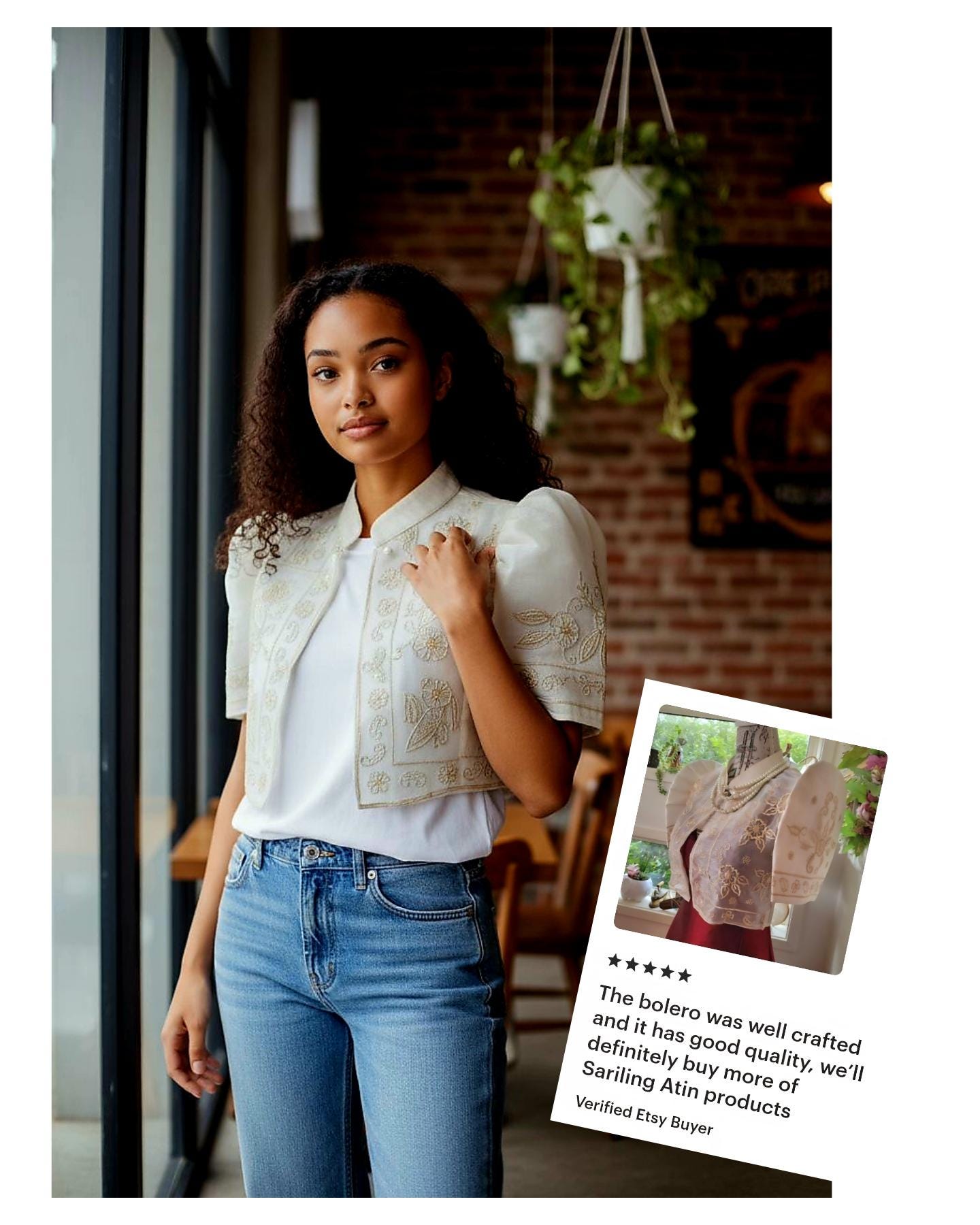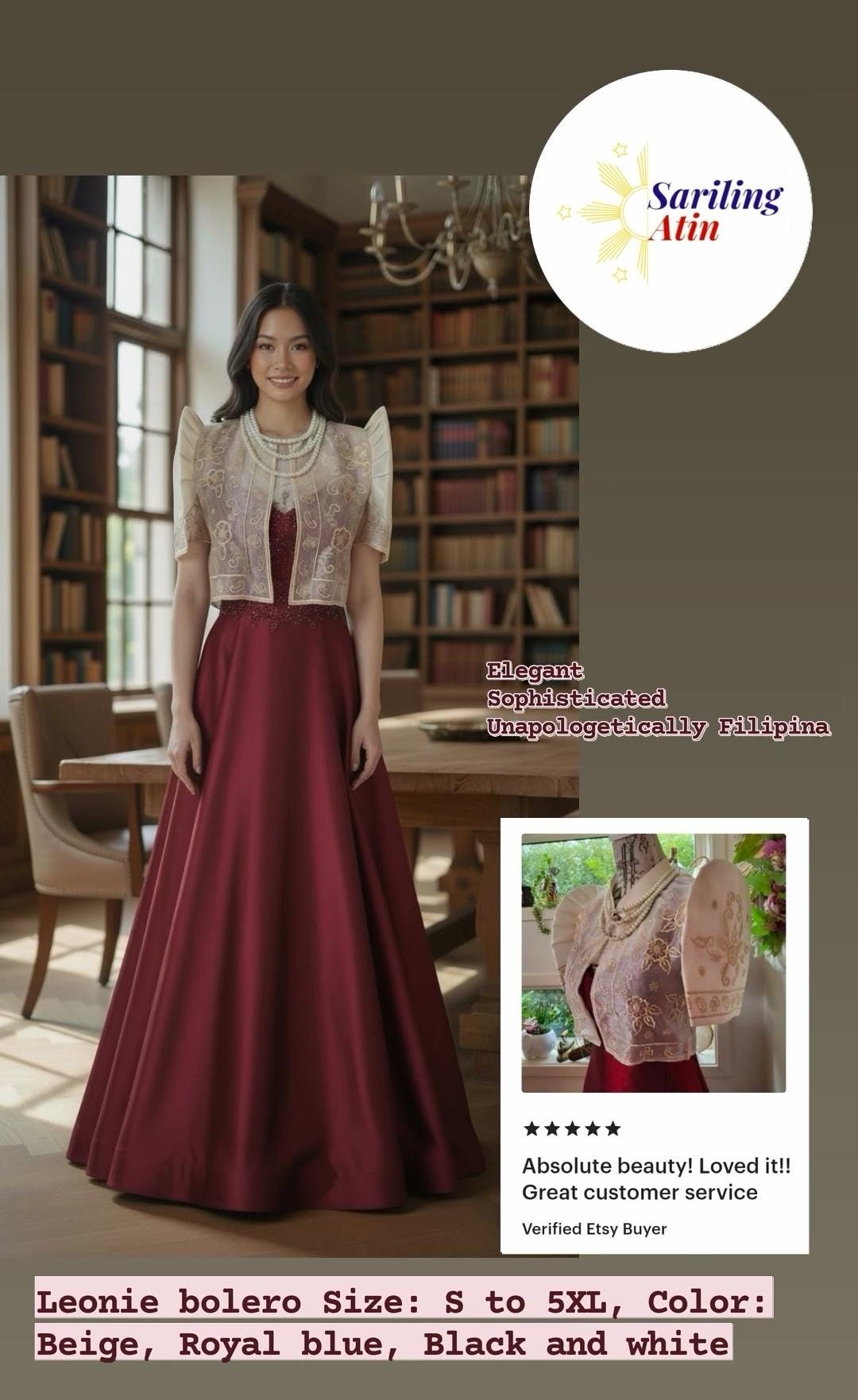 Leonie Filipiniana Bolero Embroidered, pina organza, beige, made in the Philippines, ship from Australia.